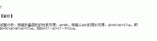 如图,将△ABC沿直线DE折叠后,使得点B与点A重合.已知AC=5cm,△ADC的周长为17cm,则BC的长为( )