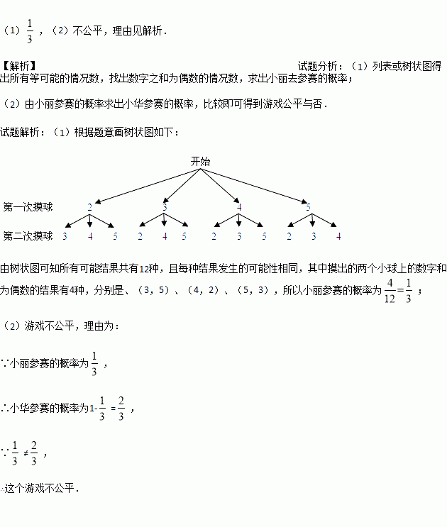 小丽和小华想利用摸球游戏决定谁去参加书法比赛,游戏规则是:在一个不透明的袋子里装有除数字外完全相同的4个小球,上面分别标有数字2,3,4,5.一人先从袋中随机摸出一个小球,另一人再从袋中剩下的3个小球中随机摸出一个小球.若摸出的两个小球上的数字和为偶数,则小丽去参赛;否则小华去参赛.