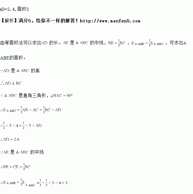 如图,△ABC是直角三角形,∠BAC=90°,AD、AE分别是△ABC的高和中线,AB=3,AC=4,BC=5.求线段AD的长和△ABE的面积。