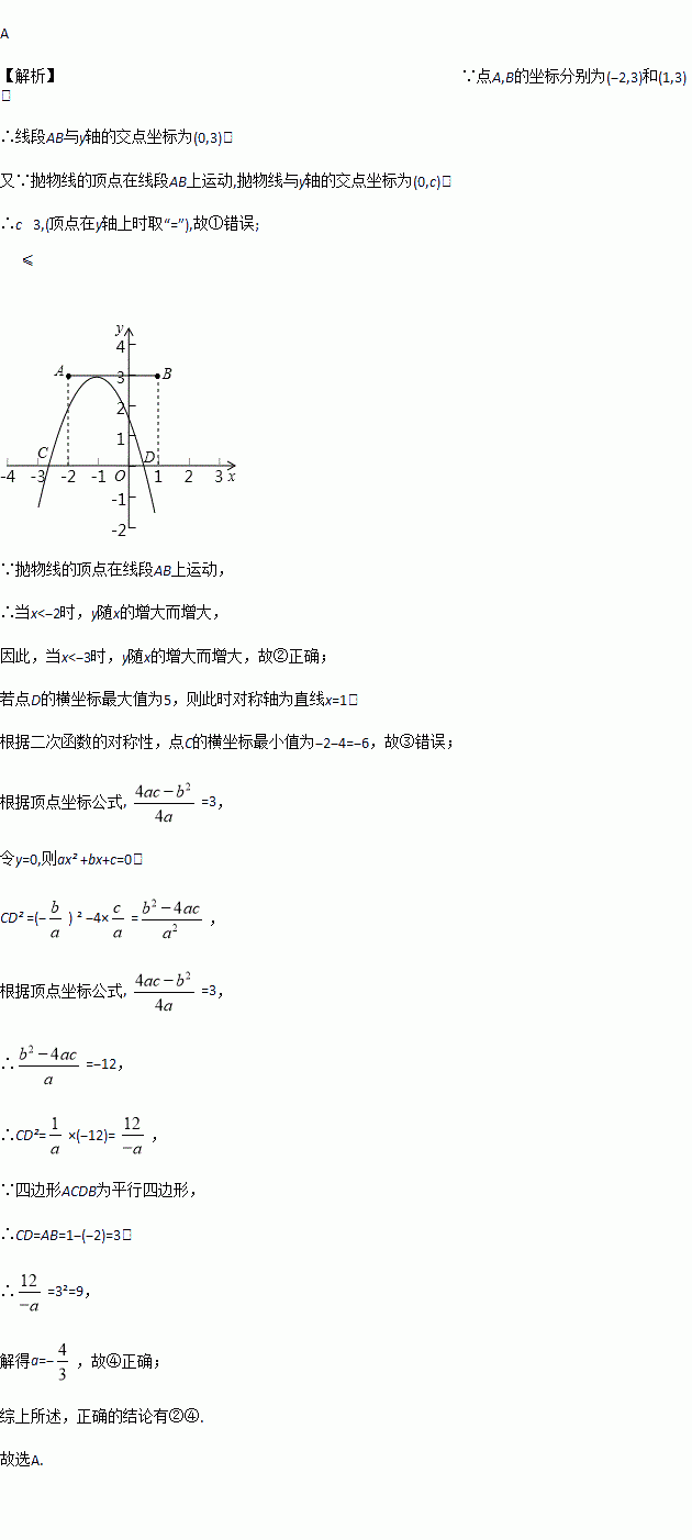 点A,B的坐标分别为(-2,3)和(1,3),抛物线y=ax2+bx+c(a<0)的顶点在线段AB上运动时,形状保持不变,且与x轴交于C,D两点(C在D的左侧),给出下列结论:①c<3;②当x<-3时,y随x的增大而增大;③若点D的横坐标最大值为5,则点C的横坐标最小值为-5;④当四边形ACDB为平行四边形时,a=
