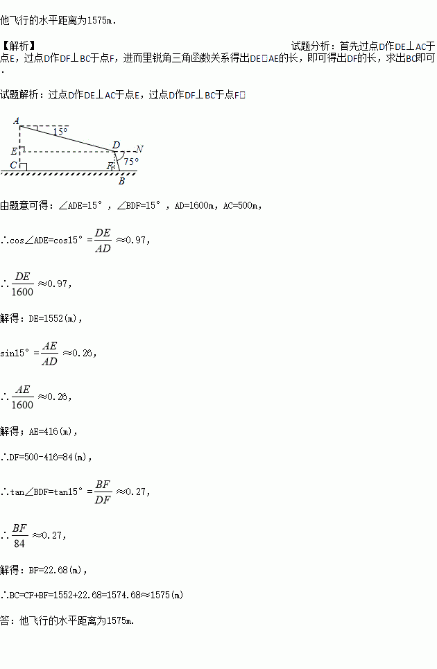 如图,某翼装飞行员从离水平地面高AC=500m的A处出发,沿着俯角为15°的方向,直线滑行1600米到达D点,然后打开降落伞以75°的俯角降落到地面上的B点.求他飞行的水平距离BC(结果精确到1m).(参考数据:sin22°≈0.3,cos22°≈0.9, tan22°≈0.4, sin53°≈0.8,cos53°≈0.6, tan53°≈1.1)(10分)