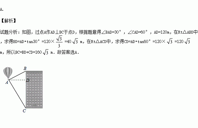 如图,热气球的探测器显示,从热气球A处看一栋楼顶部B处的仰角为30°,看这栋楼底部C处的俯角为60°,热气球A处与楼的水平距离为120m,则这栋楼的高度为( )