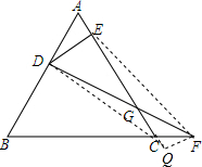 (3)当点D、F同时运动且速度相同时,线段GE的长度不会改变.理由如下:作FQ⊥AC,交直线AC的延长线于点Q,连接FE,DQ,由点D、F速度相同,得到AD=CF,根据等边三角形的性质得到∠A=∠ABC=∠QCF=60°,推出△ADE≌△CFQ(AAS),根据全等三角形的性质得到AE=CQ,DE=QF且DE∥QF,证得四边形DEFQ是平行四边形,根据平行四边形的性质得到GE=$\frac{1}{2}$EQ,推出GE=$\frac{1}{2}$AC,即可得到结论.