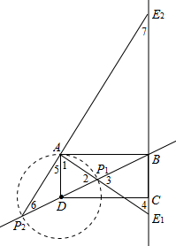 如图所示,以点D为圆心,DA长为半径作圆,交直线BD于点P1、P2,连接AP1、P2A并延长,分别交直线BC于点E1、E2