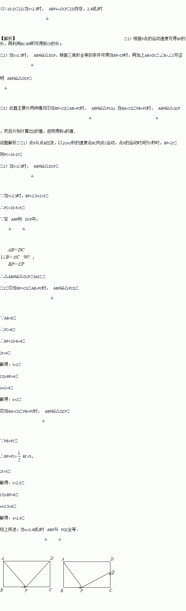 £¨3£©µ±µãP´ÓµãB¿ªÊ¼Ô˶¯£¬Í¬Ê±£¬µãQ´ÓµãC³ö·¢£¬ÒÔv cm/ÃëµÄËÙ¶ÈÑØCDÏòµãDÔ˶¯£¬ÊÇ·ñ´æÔÚÕâÑùvµÄÖµ£¬Ê¹µÃ¡÷ABPÓë¡÷PQCÈ«µÈ£¿Èô´æÔÚ£¬ÇëÇó³övµÄÖµ£»Èô²»´æÔÚ£¬Çë˵Ã÷ÀíÓÉ£®