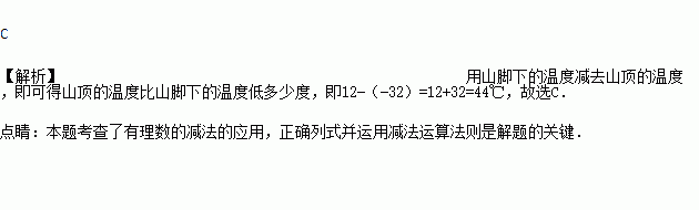 六月份某登山队在山顶测得温度为零下32度,此时山脚下的温度为零上12度,则山顶的温度比山脚下的温度低( )
