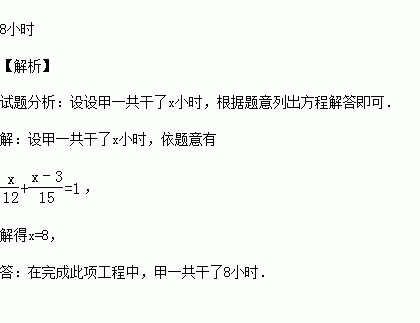 (2015秋•日照期末)一项工程,如果由甲单独做,需要12小时完成;如果由乙单独做,需要15小时完成.甲先做3小时,剩下的工程由甲乙合作完成,则在完成此项工程中,甲一共干了多少小时?