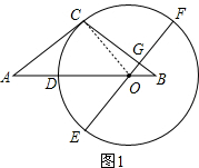 分析 (1)连接OC,根据AC切⊙O于点C得到∠COA+∠A=90°,根据EF⊥BC于点G得到∠GOB=∠CBA=90°,从而得到∠COA=∠GOB=∠DOE,相等的圆心角所对的弧相等得到$\widehat{CD}$=$\widehat{DE}$;