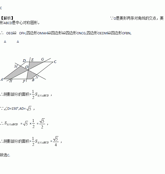 如图,点O是菱形ABCD两边对角线的交点,过O点的三条直线将菱形分成阴影部分和空白部分.已知∠D=150°,AD=