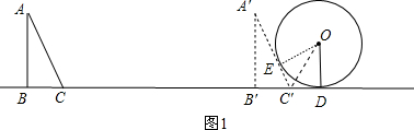 分析:(1)先根据含30度的直角三角形三边的关系得到∠A=30°,∠ACB=60°,作OD⊥直线BC,则OD=1,当△ABC的边AC与圆第一次相切时,如图1,△ABC平移到△A′B′C′的位置,A′C′与⊙O相切,作OE⊥A′C′,连接OC′,根据切线长定理得到∠OC′D=60°,在Rt△ODC′中计算出C′D=