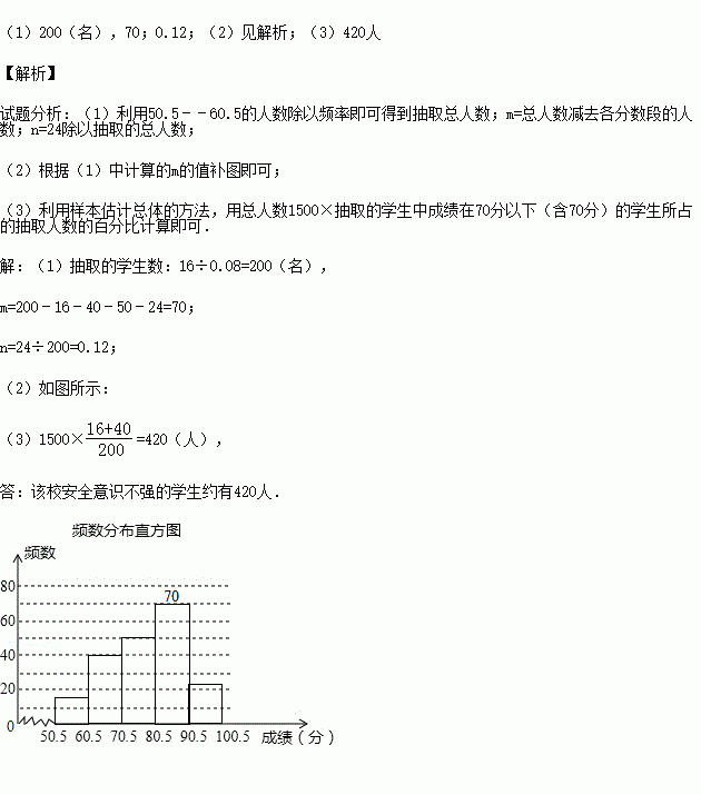 (3)若成绩在70分以下(含70分)的学生为安全意识不强,有待进一步加强安全教育,则该校安全意识不强的学生约有多少人?