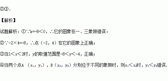 ,则有①它的图像在一、三象限;②点(-2,4)在它的函数图像上;③当1<x<2时,y的取值范围是-8<y<-4;④若函数的图像上有两个点A(x1,y1),B(x2,y2),那么当x1<x2时,y1<y2。以上叙述正确的是 ____ _____.