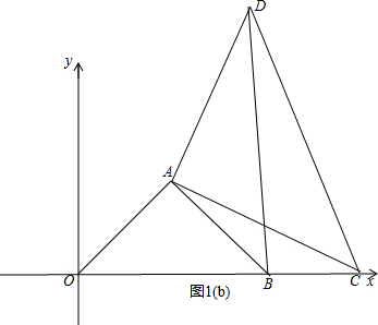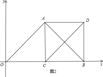(2)根据已知条件得到CB=2,OC=6,求得t=6÷1=6s,如图1,过C作CE⊥OA于E,则△OCE是等腰直角三角形,根据勾股定理得到CE=OE=3$\sqrt{2}$,同理OA=AB=4$\sqrt{2}$,于是得到AE=OA-OE-$\sqrt{2}$,求出AC=$\sqrt{A{E}^{2}+C{E}^{2}}$=2$\sqrt{5}$,于是求得S△ACD=$\frac{1}{2}•AC•AD$=$\frac{1}{2}×2\sqrt{5}×2\sqrt{5}$=10,通过△AOC≌△ABD,得到BD=OC=6,∠ABD=∠AOC=45°推出BD⊥OB,于是得到结论;