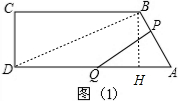 分析 (1)作BH⊥AD于H,连结BD,如图,由于点P在BC上运动时,y为定值,由图(2)得点P运动到B点时y=8$\sqrt{3}$,此时点Q运动到D点,则利用三角形面积公式可计算出AD=8,则可得点Q从点A运动到点D需4s,点P从点A运动到点B需2s,所以AB=4,M点的坐标为(2,8$\sqrt{3}$),然后在Rt△ABH中,利用勾股定理计算出AH=2,于是得到BC=DH=AD-AH=6;