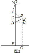 分析 过E作EG⊥地面于G,过D作DH⊥EG于H,在Rt△ABC中,求得AC=AB•cos∠CAB≈1.10,由∠CDE=60°,得到EH=$\frac{1}{2}$DE=0.9,得出DF=GH=EG-EH=6-0.9=5.1,于是OF=0.5+1.10+1+5.1=7.70m.