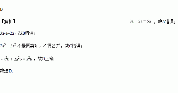 A. a•a2=a3 B. 3a+2a2=5a2 C. 2﹣3=﹣8 D.
