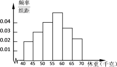 为了解全区5000名初中毕业生的体重情况,随机抽测了400名学生的体重,频率分布如图所示(每小组数据可含最小值,不含最大值),其中从左至右前四个小长方形的高依次为0.02、0.03、0.04、0.05,由此可估计全区初中毕业生的体重不小于60千克的学生人数约为________人.