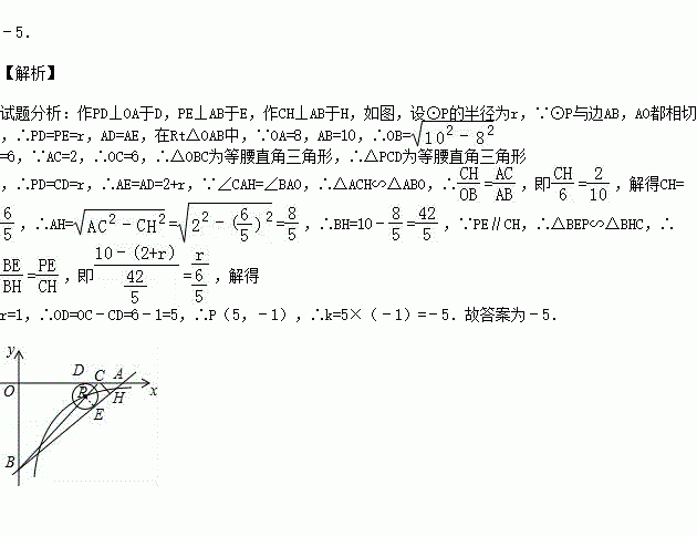 如图,OA在x轴上,OB在y轴上,OA=8,AB=10,点C在边OA上,AC=2,⊙P的圆心P在线段BC上,且⊙P与边AB,AO都相切.若反比例函数y=