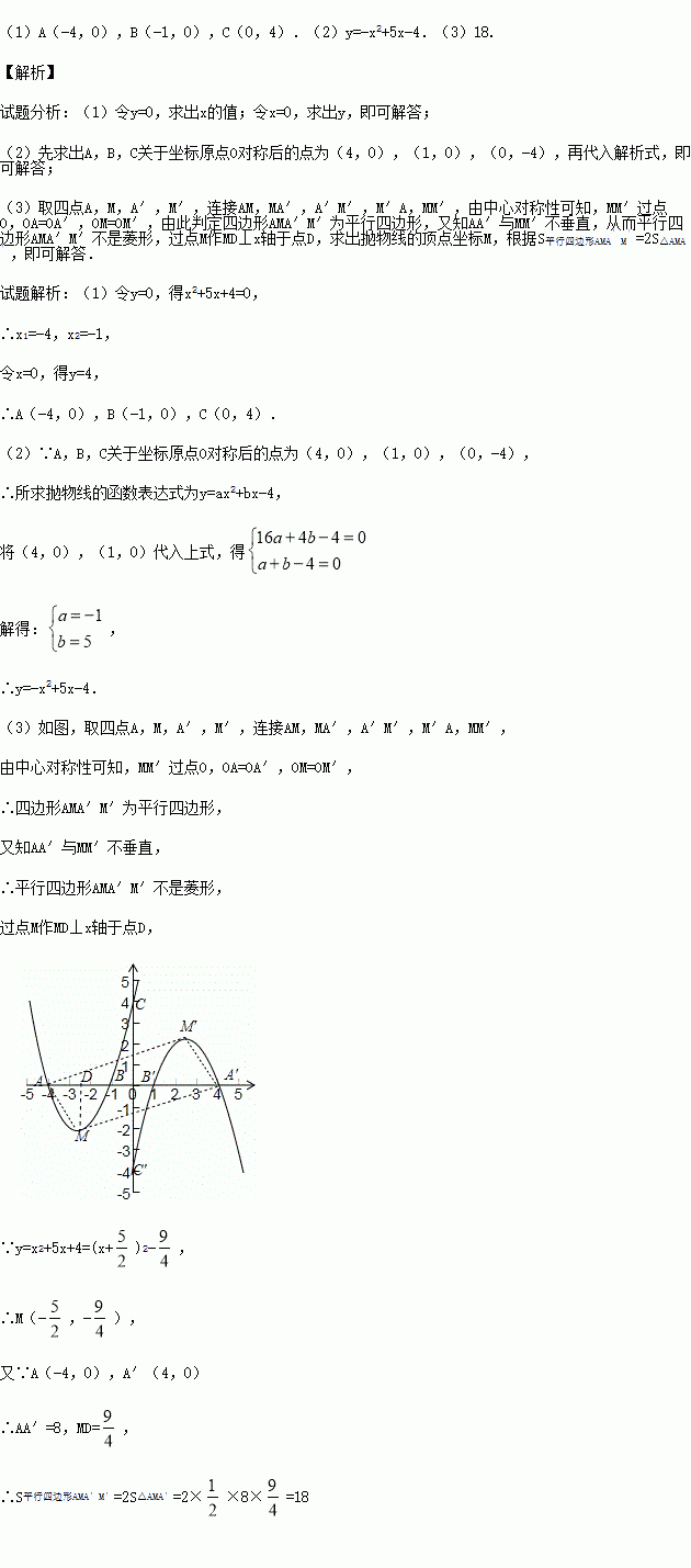 在平面直角坐标系中,抛物线y=x2+5x+4的顶点为M,与x轴交于A、B两点,与y轴交于C点。
