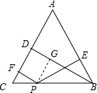 分析 根据已知,过P作PG⊥CD于G,可得矩形PGDF,所以PF=GD①,再由矩形PGDF得PG∥AB,又由AB=AC得∠ABC=∠C,所以∠CPG=∠ABC,再∠PEB=∠BGP=90°,CP=PC,则△CPE≌△PCG,所以得PE=CG②,①+②得出PE+PF=BD.