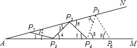 如图,一钢架NAM中,∠A=15°,现要在角的内部焊上等长的钢条(相邻钢条首尾相接)来加固钢架.若AP1=P1P2,则这样的钢条最多只能焊上