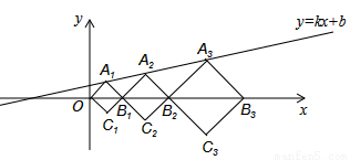 中,正方形A1B1C1O、A2B2C2B1、A3B3C3B2,…, 按图所示的方式放置.点A1、A2、A3,…和点B1、B2、B3,…分别在直线