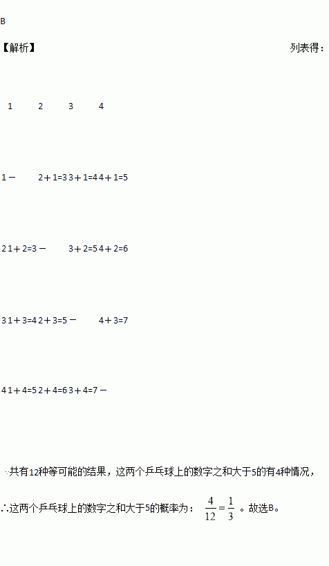 一个不透明的布袋中有分别标着数字1,2,3,4的四个乒乓球,现从袋中随机摸出两个乒乓球,则这两个乒乓球上的数字之和大于5的概率为( )