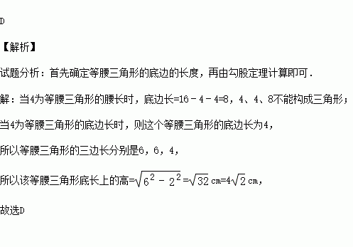 (2015秋•淮安期末)等腰三角形的周长为16cm,其中一边长为4cm,则该等腰三角形底长上的高为( )