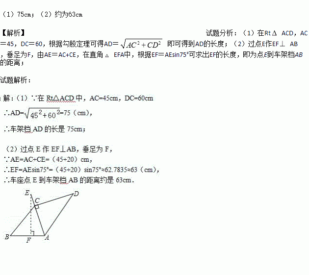 为“方便交通,绿色出行”,人们常选择以共享单车作为代步工具、图(1)所示的是一辆自行车的实物图.图(2)是这辆自行车的部分几何示意图,其中车架档AC与CD的长分别为45cm和60cm,且它们互相垂直,座杆CE的长为20cm.点A、C、E在同一条直线上,且∠CAB=75°.