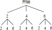 有三张形状、大小、质地都相同的卡片,正面分别写有数字2、4、6,从中随机抽出一张,将正面写有的数字记为p,放回后再从中随机抽取一张,将上面写有的数字记为q,这样以p、q为系数构成一个关于x的一元二次方程x2+px+q=0.请你画树状图或列表写出抽取两张卡片所有可能的结果,并求出任取一组p,q使一元二次方程x2+px+q=0有实数解的概率.