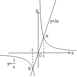 (2)画出直线y=3x和反比例函数y=$\frac{3}{x}$的图象:如图所示,![]()