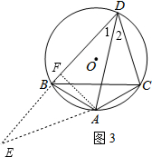 (3)延长DB到E,使得BE=DC,连接AE,过点A作AF⊥BD于点F,如图3,有(1)的结论得到∠1=∠2=90°-$\frac{1}{2}$×120°=30°,在Rt△ADF中,利用余弦定义得到DF=ADcos30°=$\frac{\sqrt{3}}{2}$AD,再证明△EBA≌△DCA得到∠2=∠1,则∠E=∠1,则可判断△ADE为等腰三角形,所以DF=EF,易得DE=BD+CD=2DF,于是有BD+CD=$\sqrt{3}$AD;