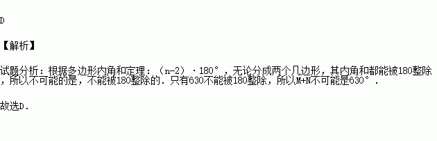 已知矩形ABCD,一条直线将该矩形ABCD分割成两个多边形,若这两个多边形的内角和分别为M和N,M+N不可能是( )