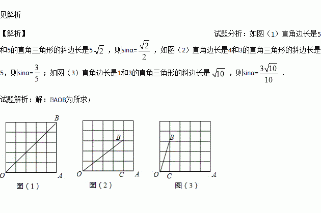 在下面的三个图中,以OA为边,在正方形网格内作∠AOB=α,B点为格点(每个小正方形的顶点)使sinα的值分别为: