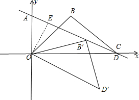 分析 如图,作OE⊥AC于E,利用一次函数解析式可确定A(0,$\frac{2\sqrt{3}}{3}$),C(2,0),则利用勾股定理得到AC=$\frac{4\sqrt{3}}{3}$,则∠ACO=30°,所以OE=$\frac{1}{2}$OC=1,∠EOC=60°,由△OBD为等腰直角三角形得到OB=$\frac{\sqrt{2}}{2}$OD=$\sqrt{2}$,∠BOD=45°,再根据旋转的性质得OB′=OB=$\sqrt{2}$,∠BOB′=α,接着在Rt△OEB′中,由OE=1,OB′=$\sqrt{2}$可得∠EOB′=45°,于是可计算出∠B′OC=15°,所以∠BOB′=∠BOC-∠B′OC=30°.