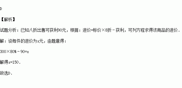 (2015秋•连城县期末)商场将某种商品按标价的八折出售,仍可获利90元,若这种商品的标价为300元,则该商品的进价为( )