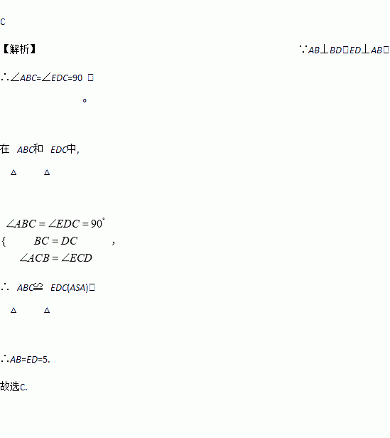 要测量河岸相对两点A、B的距离,已知AB垂直于河岸BF,先在BF上取两点C、D,使CD=CB,再过点D作BF的垂线段DE,使点A、C、E在一条直线上,如图,测出BD=10,ED=5,则AB的长是( )