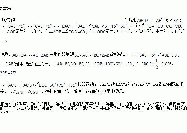 如图,矩形ABCD中,AE平分∠BAD交BC于E,∠CAE=15°,则下列结论①△ODC是等边三角形;②BC=2AB;③∠AOE=135°;④S△AOE=S△COE 其中正确的结论的序号是__________