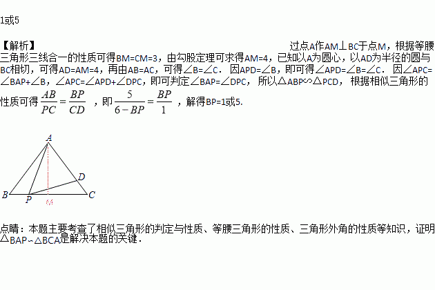 如图,在△ABC中,AB=AC=5,BC=6,点P是BC边上一动点,且∠APD=∠B,射线PD交AC于D.若以A为圆心,以AD为半径的圆与BC相切,则BP的长是_______.