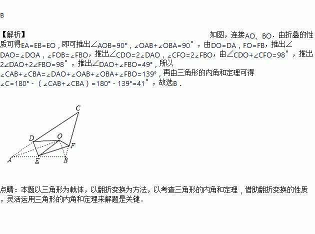 如图,将△AB C沿DE,EF翻折,顶点A,B均落在点O处,且EA与EB重合于线段EO,若∠CDO+∠CFO=98°,则∠C的度数为( )