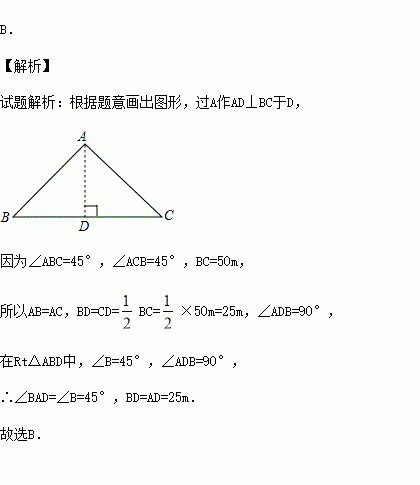 B、C是河岸边两点,A为对岸岸上一点,测得∠ABC=45°,∠ACB=45°,BC=50m,则河宽AD为( )