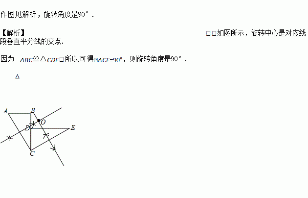 如图,已知:B、D 、C在一直线上,∠ABC=∠CDE=90°,△ABC≌△CDE,并且将△ABC逆时针旋转可得到△CDE.请你利用尺规作出旋转中心O(保留作图痕迹,不写作法,注意最后用黑色签字笔加黑),并直接写出旋转角度是 度.