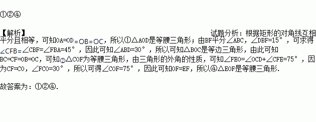 如图,已知矩形ABCD的对角线AC、BD交于O点,∠ABC的平分线交AC于E,交CD于F,∠DBF=15°,连结OF,则下列三角形①△AOD,②△COF,③△DOF,④△EOF中是等腰三角形的为________(填入序号)。