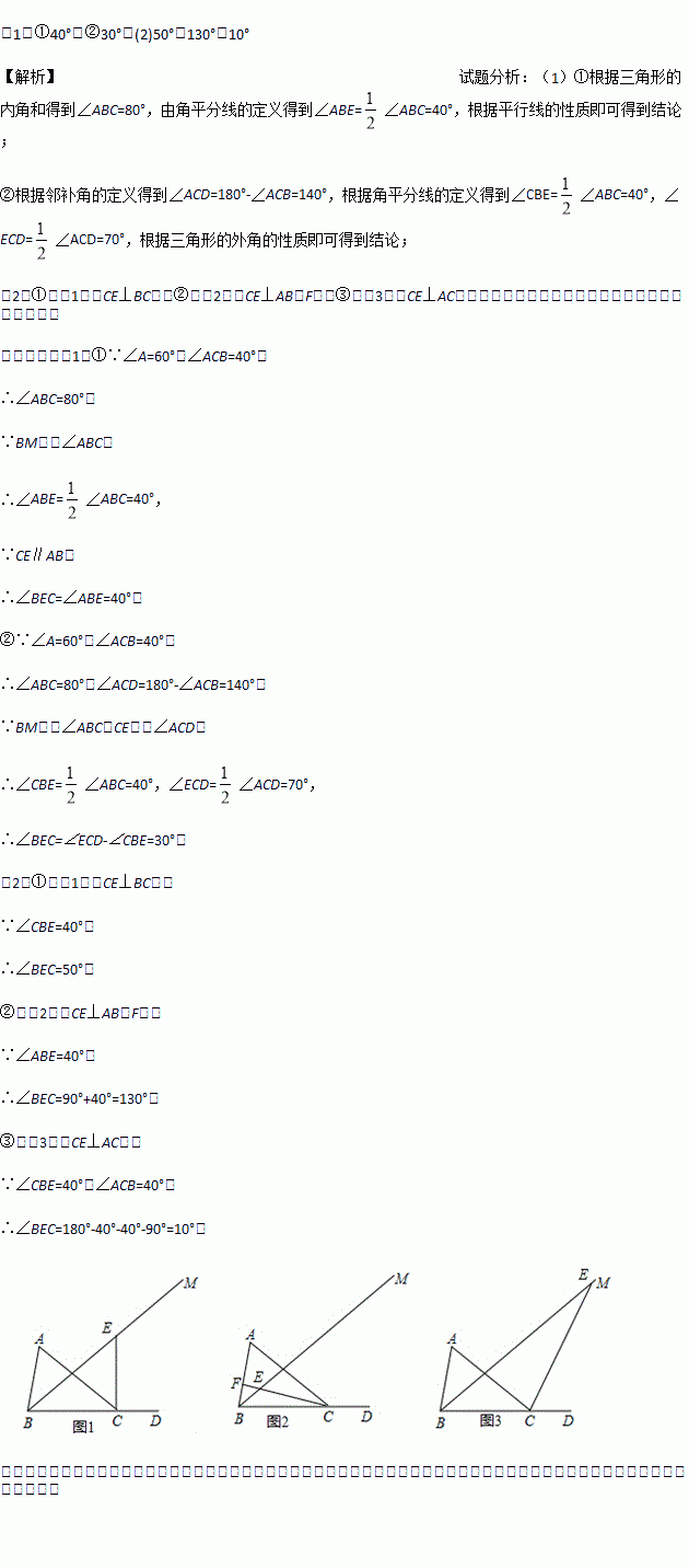 已知△ABC 中,∠A=60°,∠ACB=40°,D为BC边延长线上一点,BM平分∠ABC,E为射线BM上一点.