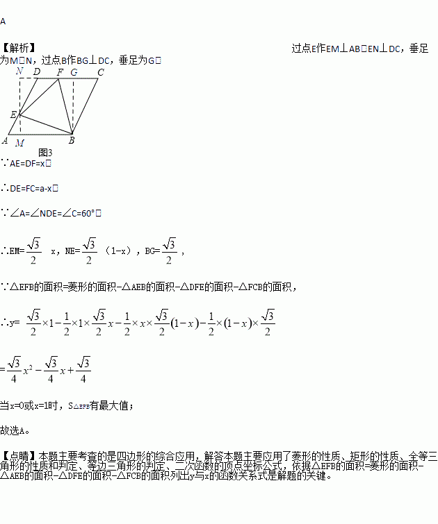己知菱形ABCD的边长为1,∠DAB=60°,E为AD上的动点,F在CD上,且AE+CF=1,设ΔBEF的面积为y,AE=x,当点E运动时,能正确描述y与x关系的图像是:( )