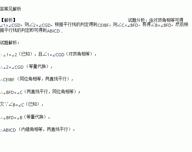 ∴∠ 2 =∠CGD(等量代换).