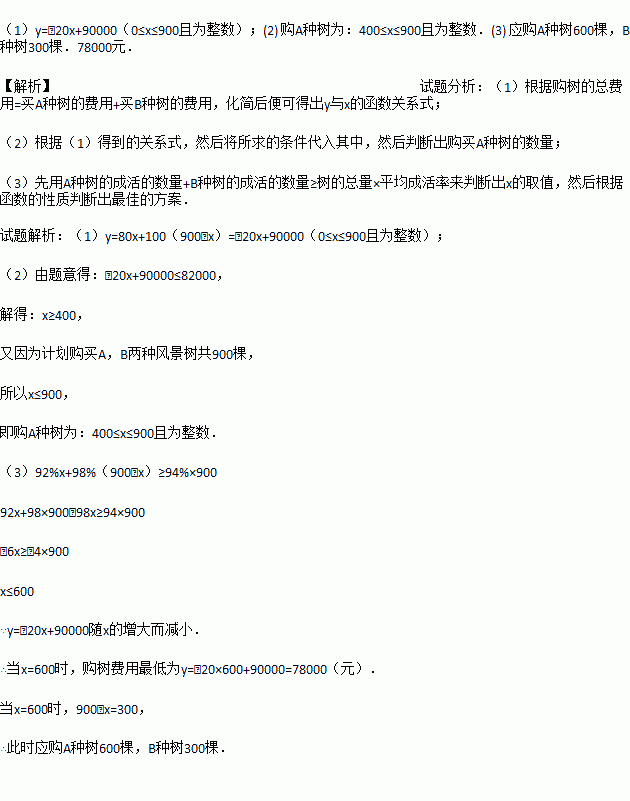 (3)若希望这批树的成活率不低于94%,且使购树的总费用最低,应选购A,B两种树各多少棵?此时最低费用为多少?