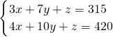 ∴x+y+z=3(3x+7y+z)-2(4x+10y+z)=3×315-2×420=105.