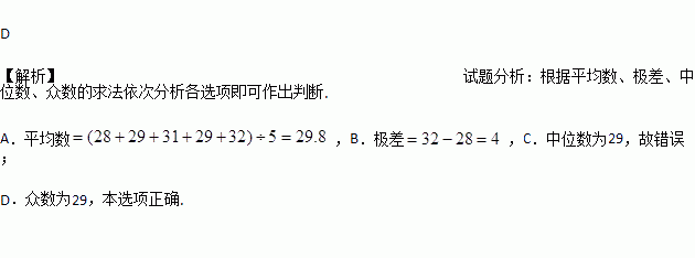 A. 平均数为30 B. 众数为29 C. 中位数为31 D. 极差为5