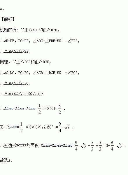 如图,分别以△ABC的三边为边在BC的同侧作正△BCE、正△ABF和正△ACD,已知BC=3,高AH=1,则五边形BCDEF的面积是( )